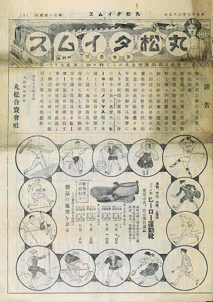 「ヒーロー印」のメリヤス製品販売元、丸松合資会社の商報だ。第一面に謹告と、「ヒーロー運動靴」広告が載る。例のタテヨコ組み替えで謹告をご紹介。