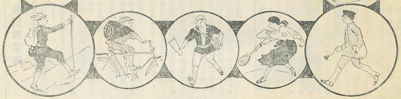 登山、自転車で商品配送、新聞配達、女学生のテニス、通学