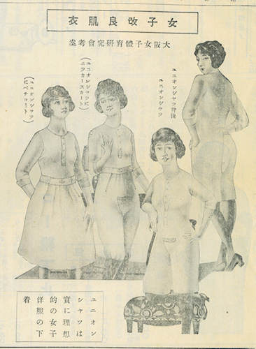 この商報には「女子改良肌衣」が載っている。「大阪女子体育研究会考案」とあるから、運動に適した活動的な下着を標榜している筈なのだが、今日の女性下着(写真や画で見ているだけですよ)と比べると旧態依然、活動的には見えない。とは云え、膝を曲げ、脚を前後左右に振り回す―跳ぶ・走る・蹴る―際に裾が乱れることは無さそうだ。腰巻きをしてキモノを着て歩いた事は無いから想像だけで云うが、どれだけ当時の女性が不自由であったのか、と思ってしまう(当事者はそれしか知らぬから、不自由とは感じていなかったのか?)。