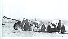 ドイツ対戦車砲三役揃い踏みの図(ANTI−TANKより)。左より、7.5cmPAK41、5cmPAK38、3.7cmPAK35/36。当然口径が大きいほど、大砲自体も大きくなっているのが理解できよう。すなわち、それだけ取り回しが面倒になると云う事でもある。