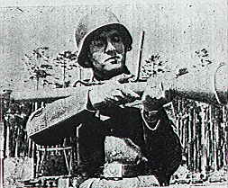パンツァーファーストを持つ兵士。ほら、太いでしょ?(「陸軍画報」昭和19年頃?)「至近距離から発射され、十糎以上の装甲版をも見事に射ち抜く」とある。