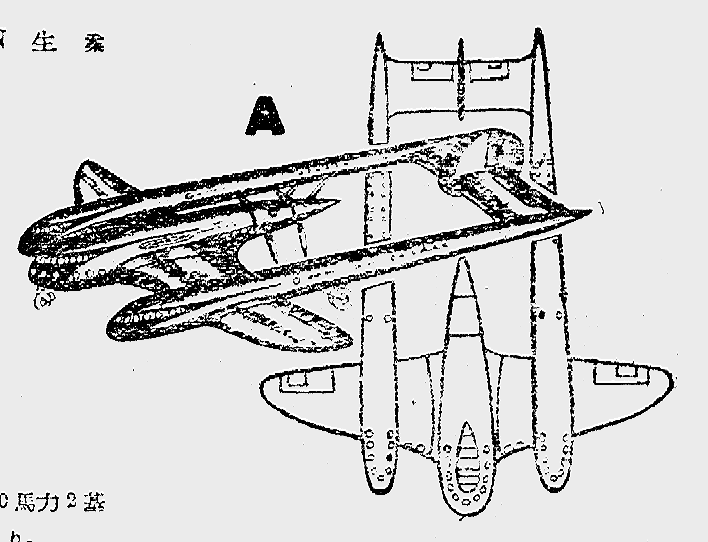 幼稚な主観より成る妄想型と云えよう。双胴の場合水平尾翼の中央に垂直舵を設ける事は翼振れを起こす故、両側に斜支柱を附せざる限り実際問題として不可であろう。