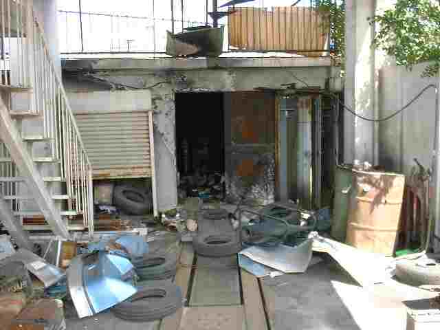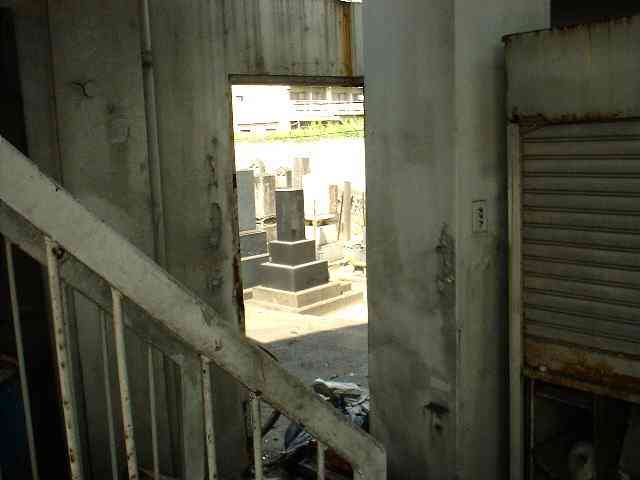 裏口 なんと、裏には墓地が隣接していました!! こんな臭いところの隣で眠らなくてはならない、仏様に 同情の念を禁じ得ません・・・。早く取り壊せよな!! 出○石油(笑)・・・。 |