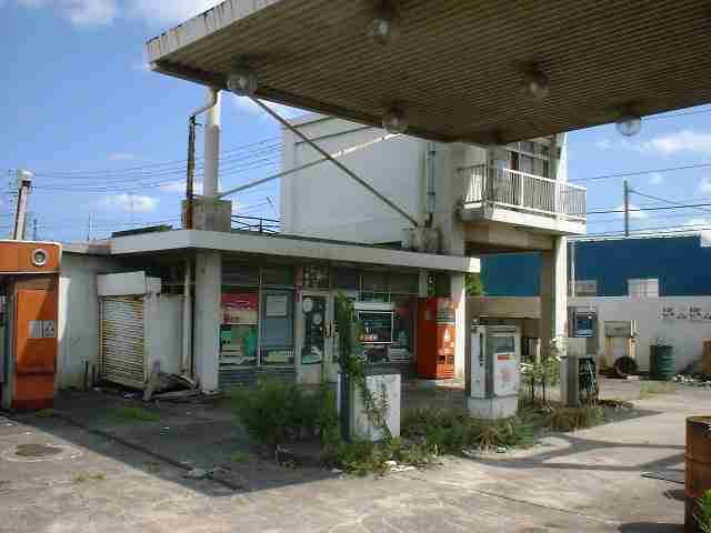 人通りが多い道に面しているため、施錠された事務所部分には潜入できなかったので、詳しい廃墟年齢は解りませんが、5〜8年ぐらいは経過していると思います。メインの国道から入った側道にあり又、国道には巨大なGSがあるため、行き残れなかったのではないかと思います。