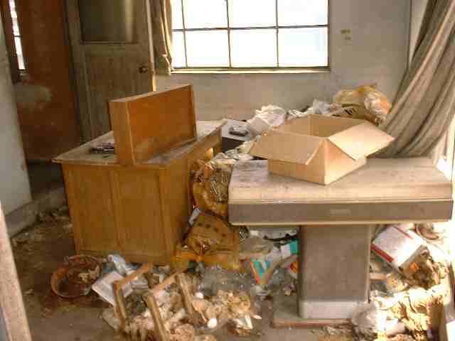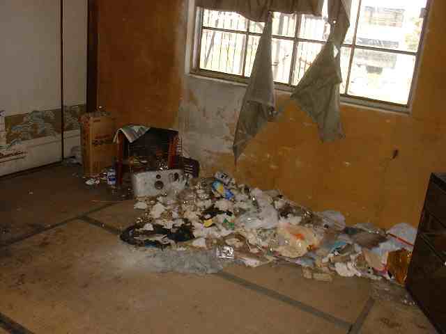 奥の部屋 同じくゴミが散乱していて、異臭が漂っています。 人が住んでいたような形跡が有ります。 気持ち悪くなってきましたので、早々に立ち去ります。 |