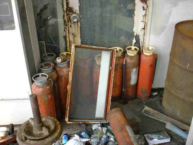 消火器の山 下は、無機物のゴミ、上は有機物のゴミ・・・。 これほど、消え去ってほしい廃墟も珍しいです。 大量の大型消化器の残骸がGSっぽいです。 |