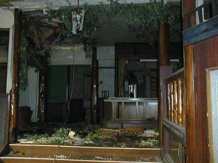 フロントです。 正面玄関から入った所フロントです。屋根の一部が崩れかけていますが、それほどひどく荒らされた感じは有りません。3mの柵のお陰でしょうか? 天井の蔦は「作り物です」今ではオリジナルが・・・。 |