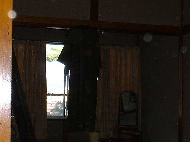 ひとがたぶら下り物です!! 部屋のドアを開けると、何かがぶらさっがっています。 一瞬「首吊り」かと思い心臓が2秒ほど停止しました。鴨居に浴衣が掛けてあるだけでした。 後日、これを仕掛けた方の正体がわかりました(笑)。 |