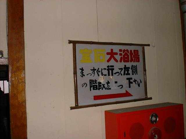 大浴場案内板です。 宝石大浴場への案内板これに従い行って見ました。 本当に、案内板がないと、たどり着けないぐらい、館内全体がトリッキーな造りです。 酔っ払いが、お風呂に行って、1人で部屋に帰りつけるのでしょうか? |