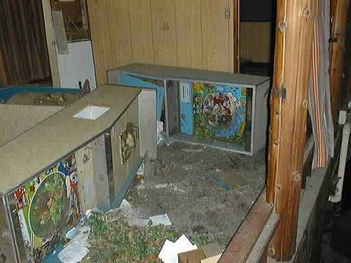厨房です。 ここも歳月以外に特に壊されたりした様子も無くいい感じです。 食器類も、かなり残されていました。 |