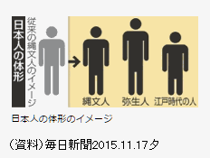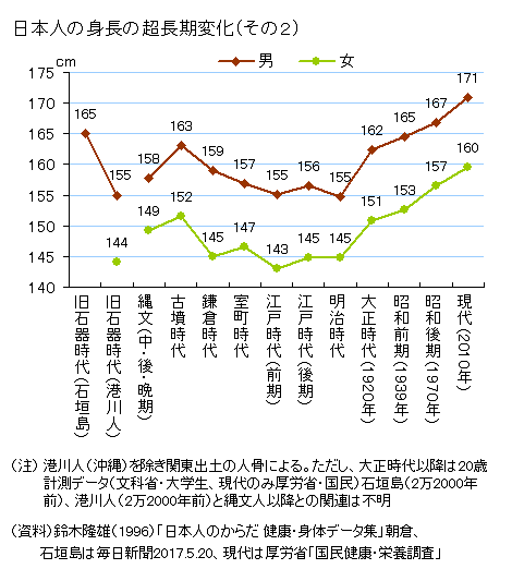 国民健康・栄養調査による計測値では、男の平均身長は、1950年の160.3pから2010年の171.5pへと10p以上、7.0%の伸びである。平均身長がこの間一貫して伸びている姿が印象的である。一方、女性の平均身長も、同時期に、148.9pから158.3pへとやはりほぼ10p、6.3%の伸びであり、男と同様、一貫して伸びている。 平均体重の方はというと、やはり増加傾向にあるが、男女に違いがある。 男は身長以上に体重の増が著しい。1950年から2010年への増加率は25.9%の伸びと身長の3倍以上の増加率となっているのである。一方、女性の方は、体重の増加率は身長の増加率よりやや高い程度である。特に、1970年代以降は、身長は伸び続けているのに、体重の増加率はかなり小さくなり、近年はほぼ横ばいといってもよい。 すなわち男性は肥満の方向に向かっている一方で女性はスリム化しているのである。もっとも体重の動きは年齢による差が大きく、ここでは示していないが40歳以上では、背とともに増加傾向が続いている。 肥満かスリム(あるいは痩せ)かを示す体格指数BMIの推移を男女別年齢別に図録2200に示し、20歳代に続いて30歳代の女性も痩せに向かっている点をみたが、身長と体重の動きでみるとこの図の通り、身長伸び、体重横ばいの結果なのである。 もっとも、戦後一貫して変化してきた以上のような傾向は2005年前後に止まったようである。身長、体重ともに、男の場合はやや低下気味、女の方は、ほぼ横ばいに転じたようである。国民健康・栄養調査がやはり毎年調べている摂取カロリーは1970年台前半にピークに達し、それ以後、低下傾向に転じている(図録0202予定)。どこまで大きな体格になるかは年少期の栄養状態が大きく影響すると考えられる。2005年の30歳代が生れたのは1964〜1975年である。この頃の栄養摂取レベルが現在の体格の基礎になっているとすると、この頃はちょうど栄養増加のピークに達した頃であり帳尻が合う。 下に年齢別の男性平均身長の伸びのグラフを掲げた。栄養摂取のピークが影響を及ぼす時期が世代によってずれていることが分かる。20代では30代よりかなり以前から身長が横ばいとなっており、40代以降ではなお身長が伸び続けているのである。 さらに、戦前からの男女24歳の身長、体重、BMIの推移グラフを、その次に、掲げた。このデータはサンプル数が少ないだけに上のデータより毎年の変動が大きいが、これによれば、日本人の男女は、戦前には身長、体重ともに徐々に大きくなりつつあった。 また、男女ともに、戦時中に、体重はそれほど変わらなかったが、身長が短くなったといえる。例えば、男24歳の身長は戦前段階で165pに達していたが、戦後直後には再度160p水準に低下し、戦前水準を上回るようになったのは1970年頃であった。なお、BMIは戦前には戦後直後と同様に女性が男性を上回っていたようである。 ![]() ![]() ![]() ![]() 参考までに骨考古学や形質人類学による縄文時代以降の日本人の身長の超長期推移を上に掲げた。 これらを見ると縄文時代から弥生時代にかけて日本人の身長は大きく伸長し、その後、古墳時代以降、江戸時代末期〜明治時代にかけて、どんどん身長が低くなっていったようである。歯の大きさについても似たような変化がある点については「歯の豆辞典」サイト参照。 時代を遡るほど日本人の身長は低かったというわけでもないようだ。「その1」の図を引用している小山修三(1982)は、弥生時代には狩猟採集経済にコメが加わって安定度を増し身長が伸びたが、その後、コメへの片寄り、肉食の忌避、不労階級の増大による栄養不足によって再度身長が低くなった可能性が高いとしている。 なお、片山一道(2015)によれば、弥生時代の出土人骨は90%以上が北部九州と西中国日本海側であり、関東の出土は10人かそこらだった。関東出土の人骨による「その2」のデータに弥生時代が欠落しているのはそのせいだろう。これは関東に遺跡が少なかったからではなく、日本列島の特殊な土壌事情と弥生時代遺跡の立地条件により縄文時代と異なり骨類が土に帰してしまいがちだったからという。また、渡来人系と考えられる北九州や西中国の出土人骨では、「成人男性の平均身長は縄文人よりも4〜5センチばかり大きい」のに対し、長崎あたりの弥生人は「まるで縄文人もどき」、また鹿児島とその島しょ部の弥生人は「顔立ちは縄文人的であるが、背が極端に低く、成人男性の平均身長は154センチほどと報告されている」(p.103)。すなわち、渡来系、縄文系(関東も)、南九州系と弥生人の地域差は大きかったことが指摘される。そして、「その1」における弥生時代の値は渡来系の値を採用していると見られるのである。 さらに、縄文人と中世人・近世人は同じように背が低かったといっても、足の長さは大きく異なっていたことも見逃せない。「縄文人は、身長が低いわりに、脚や腕が長めの体形であった。脚の長さの身長に対する比率は52%ほどと、最近の日本人と変わらないが、ほか