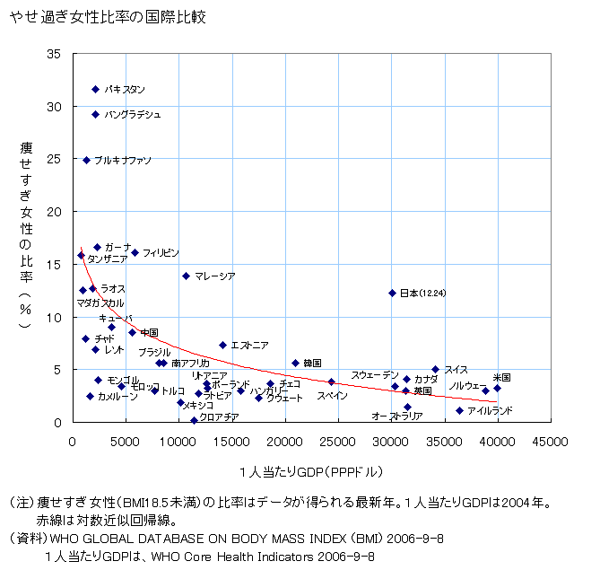 やせ過ぎ女性の比率の国際比較をグラフにした。ここで、やせ過ぎ(痩せすぎ)はBMI(体重s÷身長の二乗u)が18.5未満と定義されている。データは WHOのBMIデータベースによる(1人当たりGDPは世銀データ)。