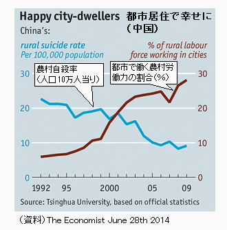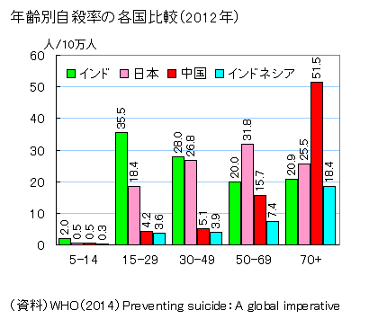 (男女別構造) 図録2772参照。ここに男女計、及び男女別の値や順位を掲載している。 (各国事情) WHOのデータ公表を受けて毎日新聞2004年10月2日では自殺に関して各国駐在員の報告をまとめている。この記事をはじめとしてその後の報道などから各国事情についてコメントする。(主要国の自殺率長期推移については図録2774参照) −ロシア・リトアニア 旧ソ連に属する両国では男性の自殺率が女性の約6倍と高く、特に45〜54歳の自殺率が高い。体制移行に伴うストレス増大の影響からか、男性の自殺の原因はアルコールが筆頭にあげられている。ロシアでは男性の平均寿命が58.4歳と極めて低く(2002年データ、WHOによる。女性は72.1歳)、異常な寿命低下が厭世観をさらに募らせている悪循環の存在を指摘する人口学者もいるという。もっとも、旧ソ連地域ではソ連時代の1980年代から自殺率は世界の上位にあり、91年末のソ連崩壊に伴う社会混乱にだけもっぱら要因を求めることは出来ない。 −フィンランド フィンランドは自殺率(10万人当たり自殺者数)が1950年の15.5から徐々に上昇し、90年には30.3の高率となり、ハンガリーなどと並ぶ自殺大国となった。狩猟に多くの国民が親しむ国柄ゆえ、銃の所持率が高いうえ、男性は「たくましくあれ」と育てられ、周囲に相談する習慣がなかったことに高い自殺率の原因が求められた。政府は86年から対策に本腰を入れた。96年までに自殺者20%減の目標を掲げ、各界の専門家を動員し、87年の自殺者の家族全員に対する調査による要因の洗い出しを踏まえて、未遂者への公的ケア、アルコール過剰摂取防止など多くの行動計画を策定し、それらを実施に移した結果、現在では、日本を下回る世界15位の20.1人にまで自殺率を低下させることに成功した。 −日本 日本の自殺率の高さについては、WHO精神保健部ホセ・ベルトロテ博士はこう言っている。「日本では、自殺が文化の一部になっているように見える。直接の原因は過労や失業、倒産、いじめなどだが、自殺によって自身の名誉を守る、責任を取る、といった倫理規範として自殺がとらえられている。これは他のアジア諸国やキューバでもみられる傾向だ。」こうした点は当の国の人間では気づきにくい見方かと思われる。(自殺許容度と実際の自殺率との相関を図録2784に掲げた。) 英エコノミスト誌(2008.5.3)は女子生徒の硫化水素ガス自殺(4月23日)の紹介からはじまる「日本人の自殺−死は誇らしいか」という記事で日本の自殺率の高さについて論評している。経済的な要因についてもふれているが、記事の主眼は日本人の文化的な要因、あるいは社会的特性であり、上記の見方と共通している。「日本社会は失敗や破産の恥をさらすことから立ち直ることをめったに許容しない。自殺は運命に直面して逃げない行為として承認されることさえある。サムライは自殺を気高いものと見なす(たとえ、それが捕虜となってとんでもない扱いを受けないための利己心からだとはいえ)。仏教や神道といった日本の中心宗教は明確に自殺を禁じていたアブラハム系信仰と異なって、自殺に対して中立的である。」日本政府は9年間に自殺率20%減を目標にカウンセリングなどの自殺対策に昨年乗り出したが、同誌は、重要なのは社会の態度であると結論づけている。「一生の恥と思わせずにセカンドチャンスを許すよう社会が変われば、自殺は普通のことではなくなるであろう。」 −インド インドの自殺率は日本、ロシアなどに次いで高い水準にある。日本の自殺率の年齢別構造を調べてみると高齢者で高いという一般傾向より中年層の高さが目立っており、また、若年層の自殺率も低いとはいえない。しかし、若年層の自殺率の高さが日本より目立っているのはインドである(下図参照)。 ![]() インドでは自殺未遂や自殺を助長する行為までが、長年、犯罪とされており、政府は、場合によっては、ハンガーストライキを企てる活動家を投獄する手段としてこの禁止法を乱用したこともあったという。実際にこの法が適用されることは少なかったとはいえ、投獄の恐れから、自殺を予防するための精神的な病的状態への医療的ケアが難しくなり、また、自殺対策に対して人的、財政的な資源配分が行いにくい状況にあった。こうした状況を改善するため、インド下院では、一連のメンタルヘルス改革対策を講ずる法案を2017年3月27日に通過させ、その中で、自殺未遂を犯罪としない法案も含めることになったという(The Economist April 1st 2017)。アジアでは自殺は精神的な問題というより経済的な問題への衝動的行動と見なされ、対策も農薬の入手制限などが主だったが、他国と異なり自殺予防対策が存在しなかったインドでも友人や医師とのつながりを通じた精神的な対策がやっと試みられるようになったといえよう。 −スリランカ 大陸の南東方向に位置する島国である日本、スリランカ、キューバの自殺率が何故か共通して高い。女性が書いたスリランカに関するブログを見