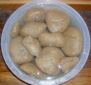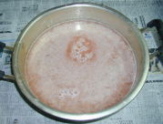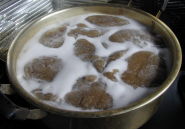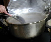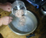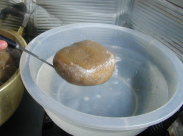 8、茹でる 凝固剤で固まってきたら、お玉にとって茹でます。 タッパに入れて茹でると四角のコンニャクが出来ます。 |