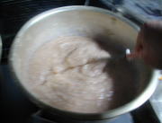 7、凝固剤 凝固剤の炭酸ナトリウムを加えて素早くかき混ぜます。 一度かたまったのがバラバラになりますが構わずかき回すと、 次第に粘ってモッタリしてきます。 |