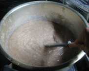 6、練る 火にかけて良く練ります。 コンニャクに透明感が出て、煮芋くさくなってきたら終了。 60度くらいになるまでねかせます。 |