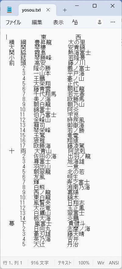 2026年3月22日のお知らせ 番付予想(千秋楽) 番付予想プログラムを動かして、番付予想してみました。 大関問題についてはよくわかりません。 それより、トランプさんなんだよねー。 こっちは直接関係するから、ニュースに釘付けです。