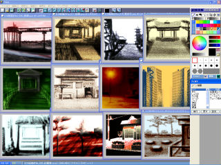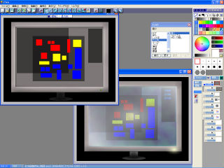 「陰影」について。 色違いの枠に効果的。ワイヤーで囲って適用させる事も可能です。 画像の場合、 正方形の大小の2つの色をボッスクワイヤーで「塗りつぶし」 ボックスワイヤーで囲って内枠やランプを「陰影」化。 周辺を薄くシャドウで囲う。 するとテレビやディスプレイモニターのような立体的な物も簡単に仕上がります。 この効果でコインの浮き出た模様のような物も簡単に作れます。 複雑な物には様々な色のディザのノイズが出てしまいますので単純な物に使うと良いでしょう。 下の画はちょっと見写真や3Dに見えますが、トーンフィルターの白と黒の向きと濃度を使いわけ、 反射やブラウン管のように写実の立体だけでなく映像画質を表現した物です。 |