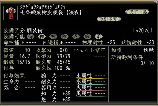 ▼新装備の相場▼ 草鞋・20−35貫が平均価格で良心的な大量売りがあった。現状は110貫価格のPCが多く目立つが購買意欲が沸かない。 篭手・400貫前後の価格が目立つ。入れ物の容量の1つになる事を考えるとまだ高価で買う気になれない。 お守り・腕力最高クラスだと1000貫前後まで価格が見える。職業中のPC売り上げ単価はトップだろう。ただし改修できないため腕力等は徒党忍者が良い。 |