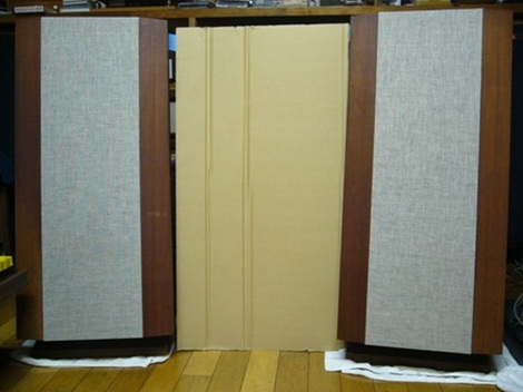 本当は木の板でやりたいのですが、ちょうどいい寸法のダンボールが部屋にあったので、ままいいや、と・・・。 スピーカーの両端も上もバッフルとしたいのですが、思い付きのイタズラですので、兎に角これで聴いてみました。 すると、何ということでしょう ! ! それまでスピーカーの中央の、やや後ろにいたヴォーカリストが、スピーカーの前に出てきたではないですか。 そして、そのリアリティの凄さ、本当に鳥肌ものです。 びっくりしました。 ということは、周りも上も全部、硬い板で覆ったらどんなことになるのでしょうか。 ここで少し冷静になって考えてみましょう。 スピーカーの後ろ1mには50インチのTV画面。 ということは、もともと、かなり反射波の影響があったはずで、それが減少したことの影響というか効果を、バッフル効果と分けてきちんと評価すべきである。 そのためには、反射波の影響がないアイソレート空間で実験すべきである。 まあ、そんな堅いことは言わずに・・・・ 上を塞ぐのは難しそうなので、今度は左右も板を立ててやってみたい。 昔の STAX の宣伝文句に「衝立にもなるスピーカー」という呆れたのがありました。 それで、以前から夢想していたことがあります。 二間続きの大広間。 中央にSTAX の大型スピーカーを設置。 真ん中と両端は襖で仕切ります。 どんな音になるのでしょうか。 どなたか大きな家をお持ちの方、やってみませんんか。 |