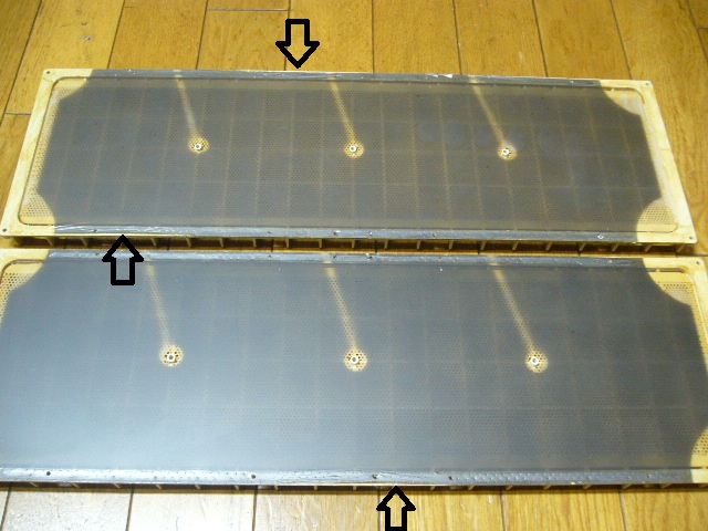 | 下の写真は、依頼を受けてレストアしたPRO-63 から外したユニットの、フィルムを貼ってある面です。 写真は二枚だけ写しましたが、片ch 四枚のうち三枚が同様な状態で、残り一枚は、別の固体から持ってきたようで、全く違う状態でした。 ご覧のとおり、カーボン導電剤の塗られていない線が斜めに走っています。 最初に見たときは、なんだこりゃ ? ? ? と思いましたが、すぐに謎は解けました。 フィルムを貼り、導電剤をスプレーする際、両端と、中央の三か所の丸い部分には、導電剤がかからないようマスキングをしています。 中央の丸をマスキングするパーツを保持するためのアームというか支えの棒がスプレーの邪魔をしたものと思います。 ちなみに、フレームのこの部分には、ボルト止めするための孔が開いていますので、丸い板を付けたボルトをこの孔に通せば簡単にマスキングできるのに・・・・ 以前の私がやっていたように・・・・ もう一つ気になったことが・・・・ カーボンの濃さです。 随分と違いがあります。 いいのかなーーー 例によって、どこがレストアしたのかの見当は付いています。 参考までに・・・・ この二枚は一見正常なようですが、二枚ともフィルムの剥離が起きていました。 判りにくいので矢印を付けておきました。 よく見ると、フィルムが浮いてフレームの端が見えているのが判ります。 フィルムのテンションが低下しており、正常な音ではなくなっていて、ノイズ発生は時間の問題という状態です。 |
