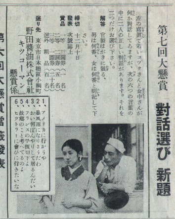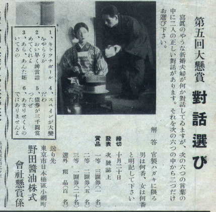 『私が「今何時でしょうか」と質(たづ)ねたら「九十の爺さんよ」と答えました。何時でしょうか?』という問を出して、正解者のうち抽選により、一等キッコーマン醤油一本、二等以下何々と定めて発表する。