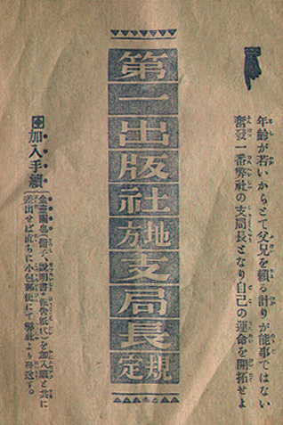 答)(略)支局長加入願と支局長事務執行説明書・報告紙其他の費用として装包送料共僅か金壱円也御送り下さい。(略)本社は到着と同時に冊子支局長嘱託證・事務執行説明書其他必要のもの一切をお送りいたします。貴下はその執行説明書によりてその日からでも事務をとって下さい。第一回の報告参り次第報酬金支局長箋(之は無代進呈のもの)を支給いたします。