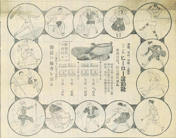 稚拙ギリギリに味ある画だ。「ヒーロー運動靴」が様々なところで使われている様子が描かれている。運動着はともかく風呂敷包みにも「HERO」と書いてあるのが楽しい。そして靴底の模様(すべりどめ)をシッカリ描く気の遣いよう!