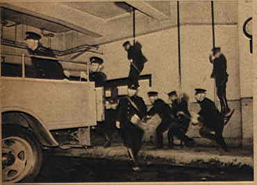 予告の日が近き、淀橋区十二荘の無駄口邸へ、警官隊が派遣されることになりました。「賊を逃してなるものか」と、颯爽と自動貨車に乗り込む警官隊の勇姿です。