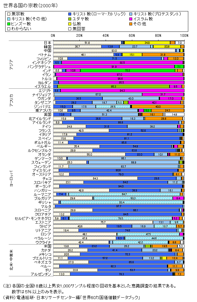 ここでは、世界各国の宗教構成をこの調査の結果から図示した。調査方法による制約を考慮に入れて結果を判断することが必要であるが、「無宗教(宗教を持っていない)」という区分があるのは、宗教団体の所属人数などからまとめた調査結果に比べて、新規の知見を与えるものであるし、また、結果から見ると宗教種類ごとの構成も調査対象数が少ない割に全国的な状況がかなり反映されていると思われる。 日本の特徴については、まず、無宗教が51.8%と過半数を占めている点が目立っている。世界的には、社会主義国・旧社会主義国で無宗教の比率は高く、第1位は中国の93.0%、第2位はエストニアの75.7%、第3位はチェコの64.3%となっている。社会主義国・旧社会主義国以外では、オランダの55.0%が最も高く、日本は、これに次ぐ地位を占めている。 日本の特徴の第2は、仏教が34.9%と多い点である。これは、図中の国の中では最も高い値である。神道は「その他」に入ると考えられるが、3.9%とそれほど多くない。 日中韓、及び中国の影響が大きかったという点で共通のベトナムを含む東アジアの宗教的特徴は、無宗教の比率が高い点と仏教の比率が高い点であり、世界の中でも特異なパターンを示している。韓国も日本と同様、社会主義国・旧社会主義国以外であるのに無宗教が36.7%と多い。もっとも、韓国の場合は、キリスト教の信者が多い点で他の東アジアと異なっている。下図のように韓国のキリスト教は第二次世界大戦後に大きく拡大したものである(原資料はここ)。 ![]() その他のアジアでは、インドネシア、南アジア、中近東などでイスラム教が大きなシェアを占めている。イスラム教は、この他、エジプト、ナイジェリア、タンザニア等のアフリカ諸国、あるいはそれほど大きなシェアでないが東欧にも広がっている。アジアに位置するとはいえ、イスラエルは特殊であり、ユダヤ教が多数を占める。この他、ユダヤ教は米国(4.2%)、タンザニア(3.6%)などにも一定のシェアをもっている。