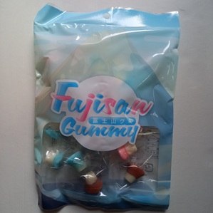 本品は、富士山の形の平たいグミ。3酒類入りで下がブルーベリー風味が水色、チョコ風味が茶色、苺風味はピンク色で上部は白色です。500円以上の価格で販売されている商品で、中国製20程個包装で入っています。