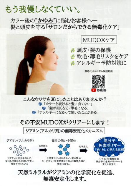 主にアレルギー反応によるかゆみでお悩みのお客様はカラー剤に含まれているジアミン(アルカリ剤)に反応して居るのですが、このジアミンを無毒化する事によって、頭皮・頭毛の保護、軟毛・薄毛リスクをケア、アレルギーの予防対策になります。