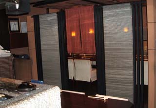 神保町の賑やかな通りから階段を降りて店にはいると、突然、静かな別な場所に移ったような感じがします。真ん中にカウンター、周りに簾などで仕切られたテーブル、全体は黒を基調とした落ち着いたカラーと照明、BGMは静かなJAZZ、高級感があふれています。