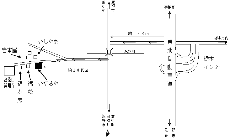 | 東北自動車道栃木インターから県道32号を左折、T字路国道293号左折。 永野川渡り信号右折し直進。 三叉路を出流山方面に左折し左側。他に同様に美味しい蕎麦8店あり。栃木インターから約 15km。 |