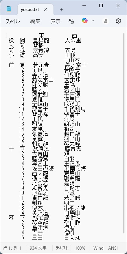 2025年11月23日のお知らせ 番付予想(千秋楽) 番付予想プログラムを動かして、番付予想してみました。 北の若は、十両残留です。 ただ、ひとつの勝ち越しなので、そこまで上がれるかは疑問です。 十両の上がれるのは、3人の可能性が高いです。 なお、らの車は新車に変わってます。 ただ、ギアがボタン式になっているので、運転が難しくてまだなれてません。