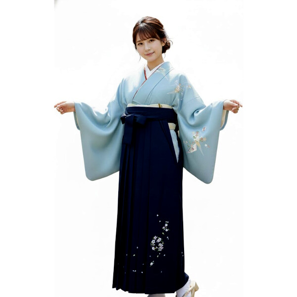 袴レンタル。正絹で作家物・上品な水色の高級な訪問着と袴のフルセットです。先生にいかが。全国宅配,下見,結婚式,披露宴,卒業ヘア,メイク。