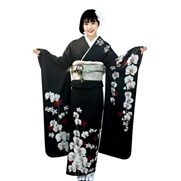 振袖レンタル。京友禅お仕立上がりの逸品。黒地で豪華な金通し振袖です。柄は少なめで、胡蝶蘭の美しい高級品。一生に一度の晴れ舞台。思い出に残る振袖を。金通しの黒地の高級品をご奉仕価格でお安くお届けします。全国宅配往復送料無料、実店舗の成人式は、美容・着付け・写真。