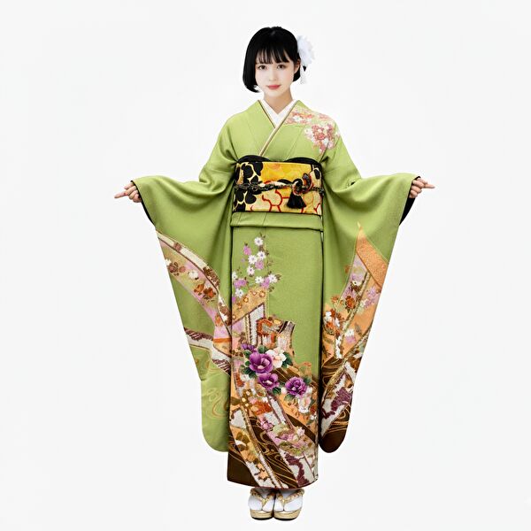 振袖レンタル。正絹で上品な鶸色(ひわいろ)。落ち着いた黄緑色のロング丈の振袖です。高級品を格安にお届けします。成人式はショール付。成人式の前撮り、当日も朝早くからお任せ。※鶸色(ひわいろ)とは?黄色味が強い黄緑色のことです。