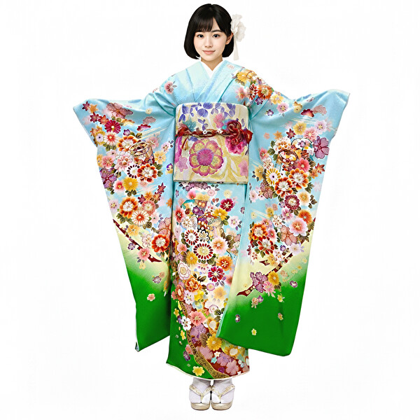 振袖レンタル。正絹で高級品の京友禅振袖です。水色地で駒取り刺繍・御所車.花柄の美しい絵羽柄の振り袖です。受注後お客様のサイズに合わせてお仕立。ご注文の前に、お客様のサイズについてご相談ください。全国宅配往復送料無料、実店舗の成人式は、美容・着付け・写真1Pプレゼントなど。