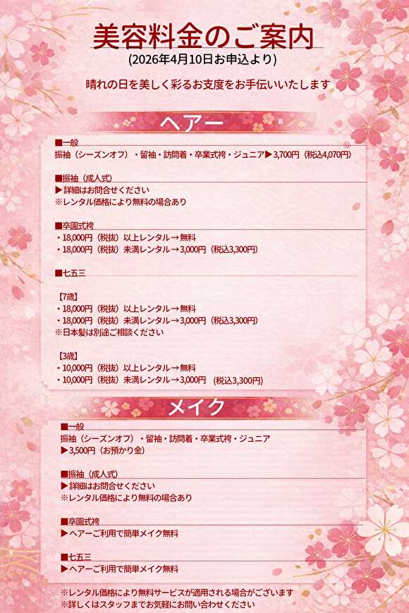 美容室様・写真館様・美容関連様のお着付けと美容について、基本的に承っておりません。宅配レンタル無料サービスで承っております。お取引契約のある店舗様は、お取引様料金で納品させて頂きます。特に美容、着付けのご希望がある場合は、お気軽にご相談ください。