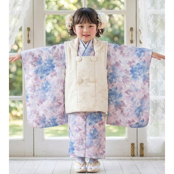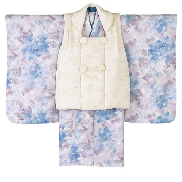 女の子被布セット 青水花・クリーム 。全国宅配・全国出張着付・下見・ご来店着付け無料。披露宴,結婚式,結納,前撮り,七五三