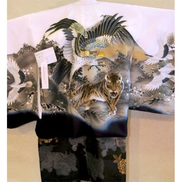 白地柄袴。背中の虎や鷹柄には、一部に細やかな金糸刺繍が施され豪華です。強く凛々しく。